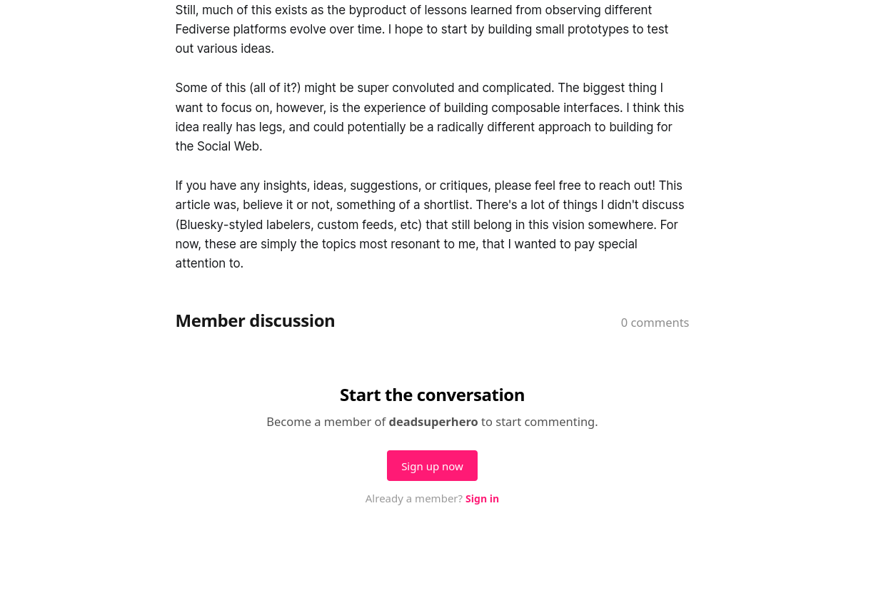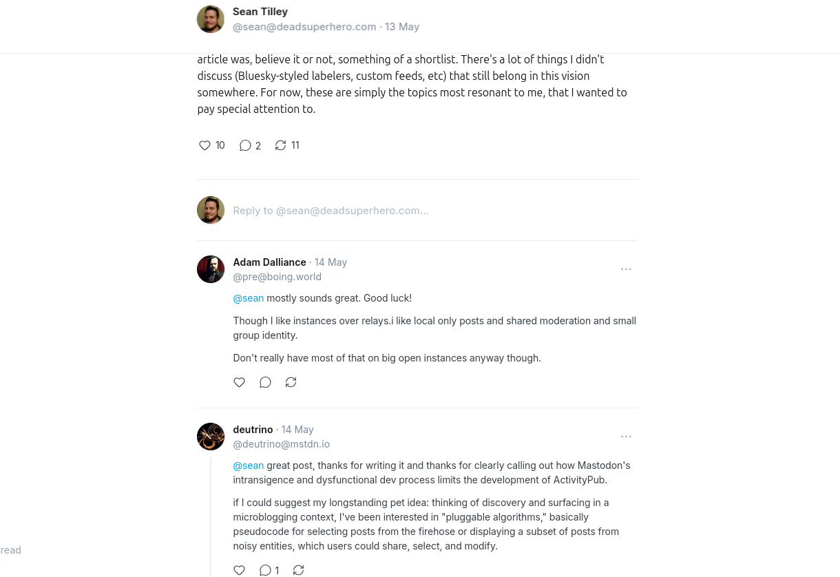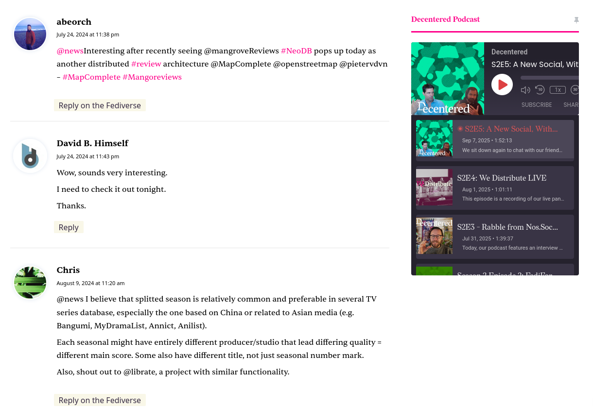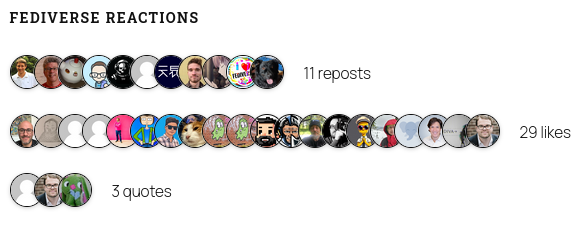 For comparison, this is something that's pretty well-supported in ActivityPub for WordPress. I just believe that social interactions should be front and center on publication sites, especially because it can encourage further interaction across the network, and help build online communities around sites that publish!