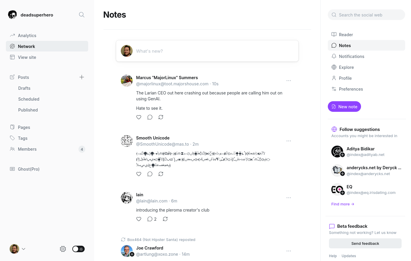 Granted, I'm not expecting Ghost to copy each and every feature that every other Fediverse platform has. It's just that the lack of all of these things combined leaves for a very limited social experience, which could lead to the social feed being an afterthought, and therefore underutilized by people using Ghost. As someone that really wants an all-in-one place for my Fediverse identity, this is a bummer.