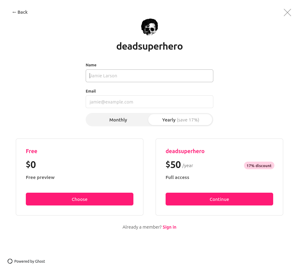 Of course, I can tell you my handle (@sean@deadsuperhero.com), but this limitation is bad UX. Even a subscription form that redirects you to your instance dashboard to subscribe would be an improvement. Which also leads to the question: why can't followers also be considered Subscribers / Members? It makes a lot of sense to put these things together.