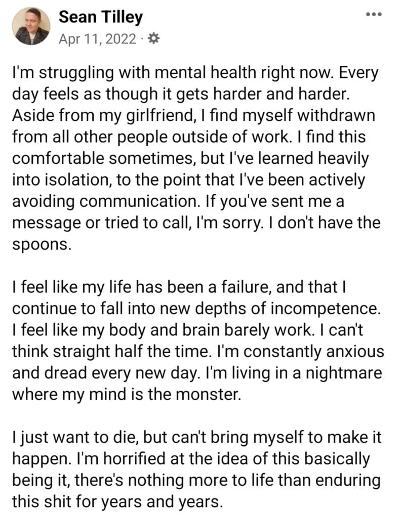 One year ago, the culmination of years of struggle against mental illness appeared to finally come to a head. In April 2022, I attempted to take my own life, after years of degradation to my emotional state and ability to handle myself.