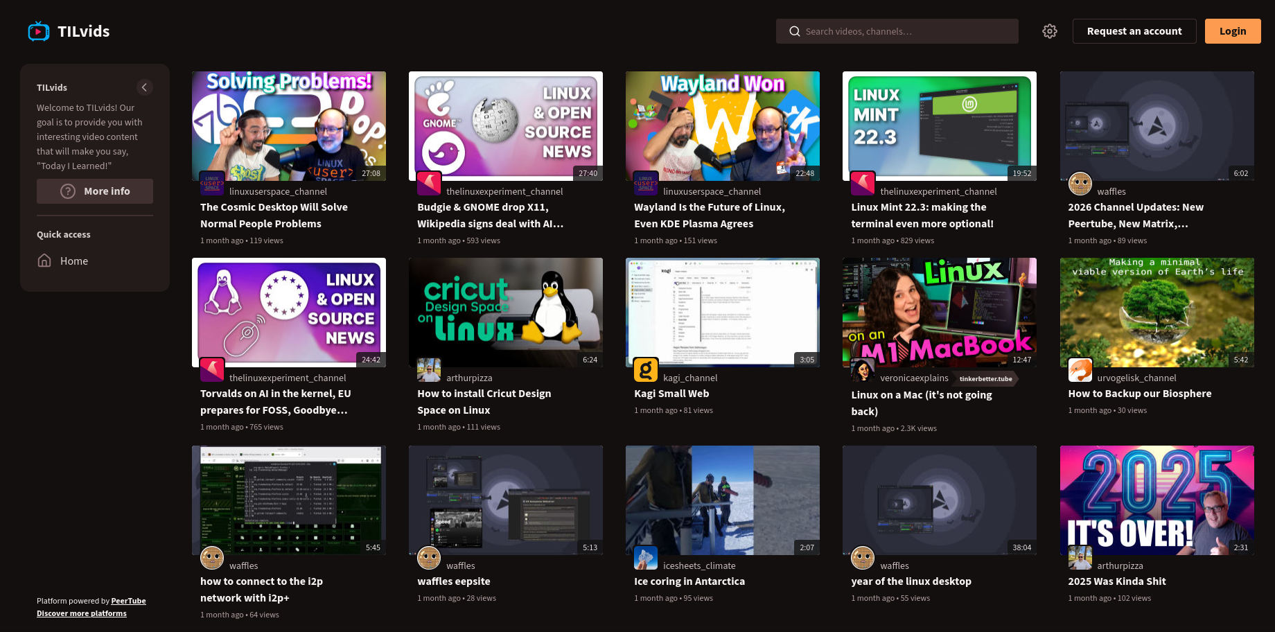 TilVids is kind of a big fish in a small pond. They have a number of YouTube creators mirroring their stuff directly onto PeerTube, with some of them even making exclusive videos just for the network.