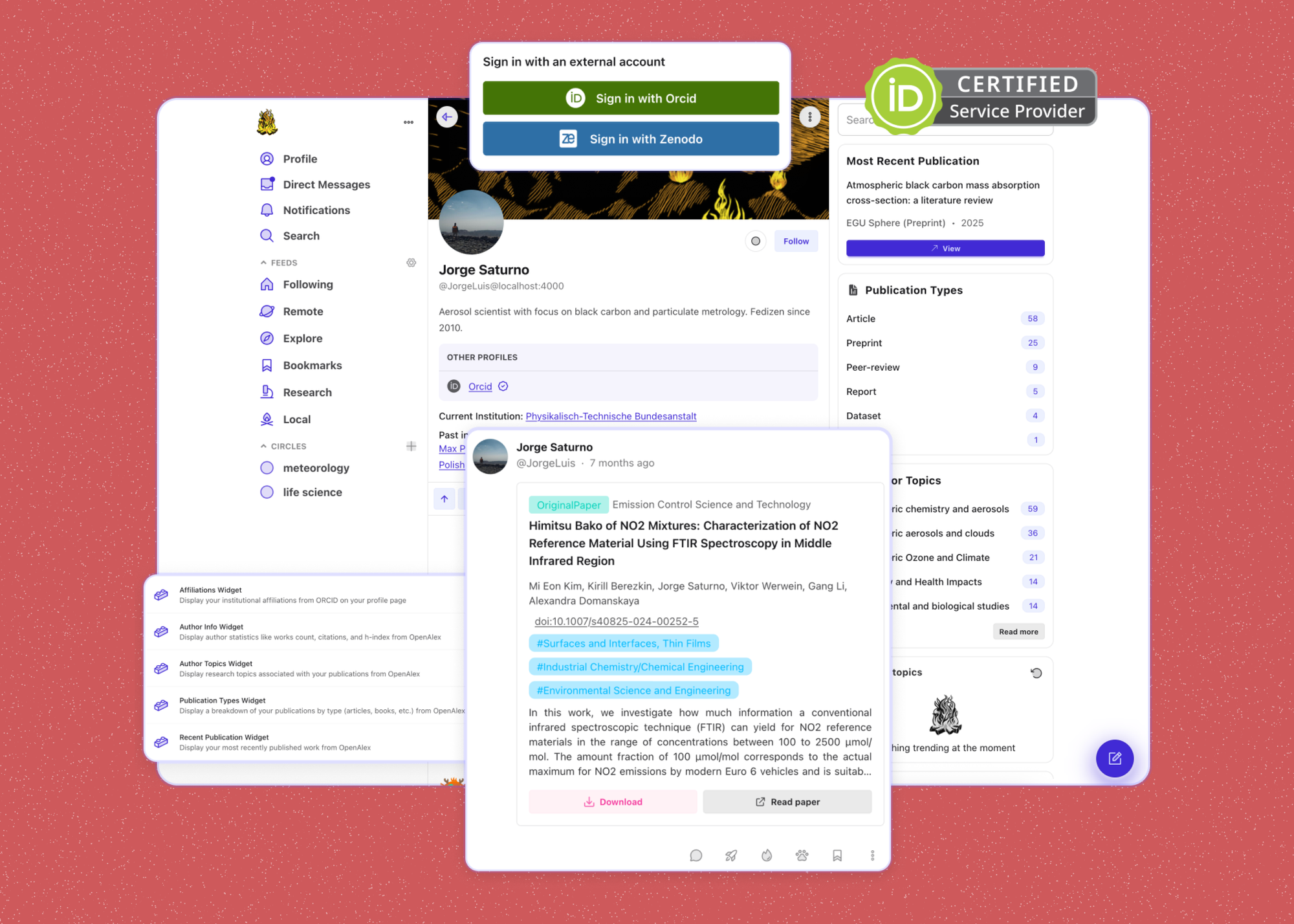 After consulting with members of the pilot program, the Bonfire team launched a dedicated instance with a number of special features. For example: researchers can log in with their ORCID identity, and automatically import their publications, which gets appended to a special section of their profiles. Published works can be easily previewed and accessed directly from within Bonfire.